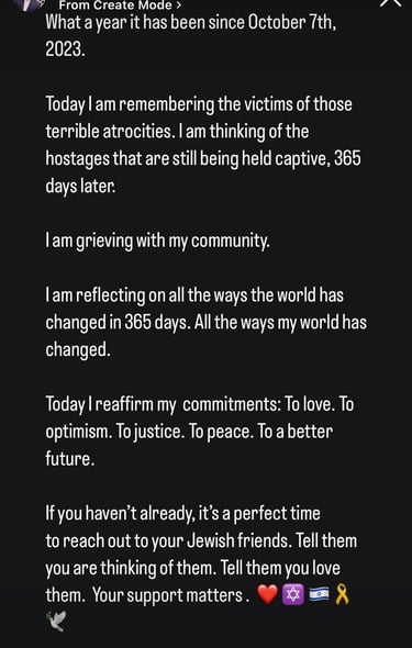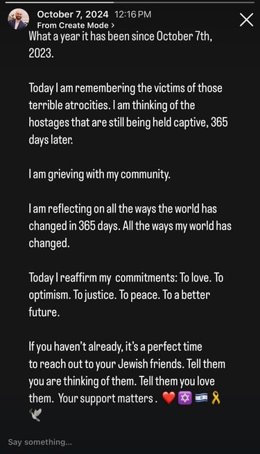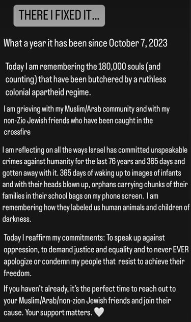 That day, I put a post up on my personal instagram. That post commemorated the atrocities of October 7th, 2023. That same member from the year prior took a screenshot, and publicly shared “edits” that better fit their narrative.