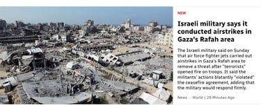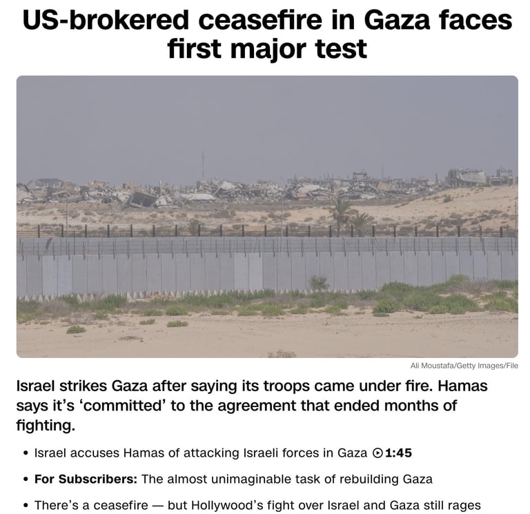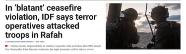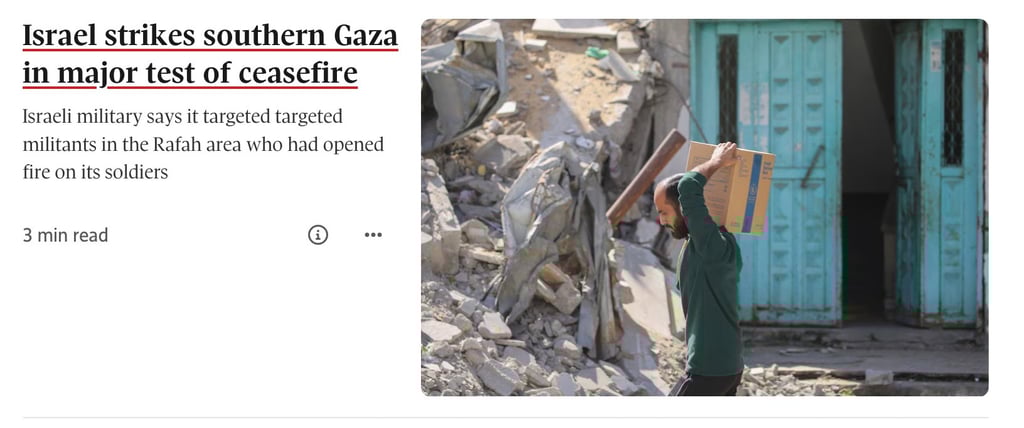 The Times of Israel starts off by citing that there was a violation to the ceasefire. It leads that the IDF believes that terror operatives (not necessarily Hamas) attacked Israeli forces in Rafah. The kicker explains that Hamas is denying responsibility, but that there was allegedly RPG and Sniper Fire directed at Israelis. It mentions that the Israeli military has responded with air strikes. This is also the first mention of the “far-right” in Israeli politics calling for a return to the Gaza war. The photo is from October 12th, and is of two Israeli soldiers in Gaza.