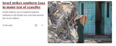 This was the biggest front page story at CNN - though it was surrounded by stories on jewel thieves, “No Kings” protests, and cowboys. Interestingly, CNN chooses to start this headline by pointing out that the ceasefire is US-brokered. Adding an American element that was seemingly not relevant to the Globe. The headline is neutral, it suggests that the ceasefire in Gaza is at risk without getting into any details. The photo is a picture of Rafah across the border taken from Egypt in August. It is vague but if you look closely enough, you do see the rubble. The “Kicker” (the key points afterwards) mentions that Israel struck Gaza after saying its troops were attacked. Meanwhile Hamas is still ‘committed’ (in quotations for some reason) to the ceasefire. Israel has also “accused” Hamas of attacking Israeli forces in Gaza.