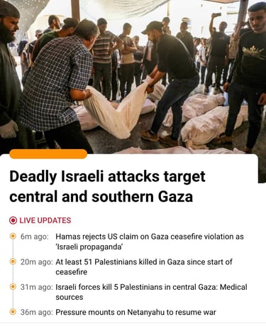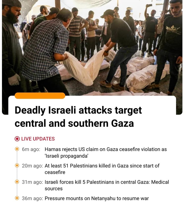 Al Jazeera chooses to immediately describe the strikes as “Deadly attacks” that are targeting multiple places within Gaza. It points out quite clearly that Hamas has rejected the claims - and infers that Israel and the US made up the attacks on the Israeli forces. It also mentions that 51 Palestinians have been killed - implying that Israel is responsible for these deaths. It adds a new claim that Israelis have killed 5 more Palestinians according to “Medical Sources” and finally that Netanyahu seems poised to restart the war. The photo depicts men carrying corpses in white blankets, there is no date or location added.